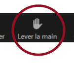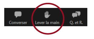 - Lors de la période de questions, faites glisser votre souris ou votre doigt au bas de votre écran pour voir apparaitre les fonctionnalités, et cliquez sur l’icône « Lever la main » au bas de l’écran. (Si vous changez d’avis, vous pouvez rabaisser votre main en cliquant à nouveau sur l’icône « Lever la main ».)