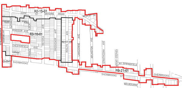 Le secteur concerné se compose des zones suivantes : R3-16-01, R2-15-01, R2-17-01, R9-21-01 et C5-20-01. Un croquis du secteur se retrouve ci-après :