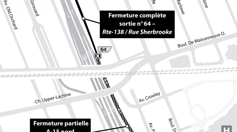 - Fermeture complète de la sortie no 64 – Route 138 (rue Sherbrooke) de l’autoroute 15 en direction nord.