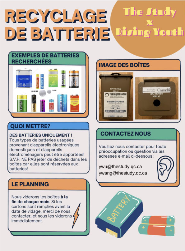 Pendant leur année scolaire, Aileen (Yitong) Wang et Yian (Olivia) Wu de l’école The Study ont travaillé sur un projet de service communautaire sur le recyclage des piles. Ce projet leur a permis d’obtenir une subvention du programme JeunesEnAction afin d’acheter une boîte de recyclage de piles. Cette boite est installée à la Bibliothèque publique de Westmount. N’hésitez pas à venir y déposer vos piles usagées.