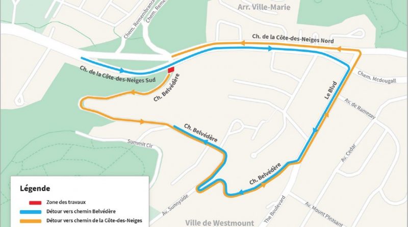 - Fermeture complète du chemin Belvédère à l’intersection du chemin de la Côte-des-Neiges;